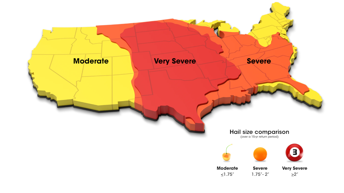 Even if you live in an area of the country that gets moderate to severe hail, your best bet is to prepare for the most severe hail that may come your way. Reference FM Global's U.S. hail zone map5 above.