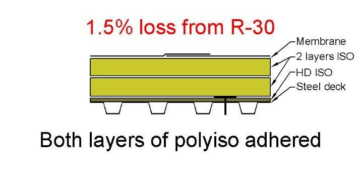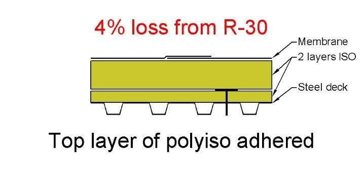 Adhering instead of fastening the top layer of polyiso resulted in an in-service R-value of R-28.7 (a 4% loss compared to the design R-value).