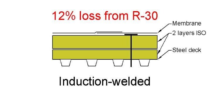 An induction-welded roof was a slight improvement over the mechanically attached assembly, with an in-service value of only R-26.5 (a 12% loss compared to the design R-value).