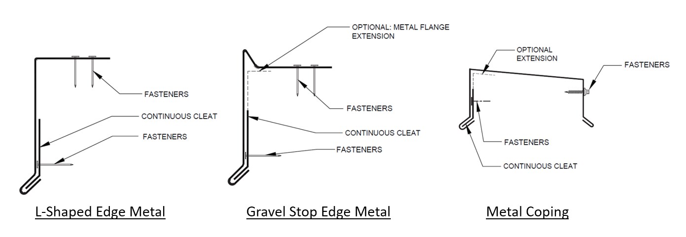 The term 'edge metal' encompasses three foundational shapes that are used at a roof's perimeter: L-shaped metal, gravel stop metal, and copings for parapets. The figures below show generic shapes; ones that are often contractor-fabricated. Additionally, there are many manufacturers that provide edge metal. Some of the manufacturer-fabricated shapes are similar to those shown below. However, some are a bit more distinct and some are extruded to achieve more unique shapes.