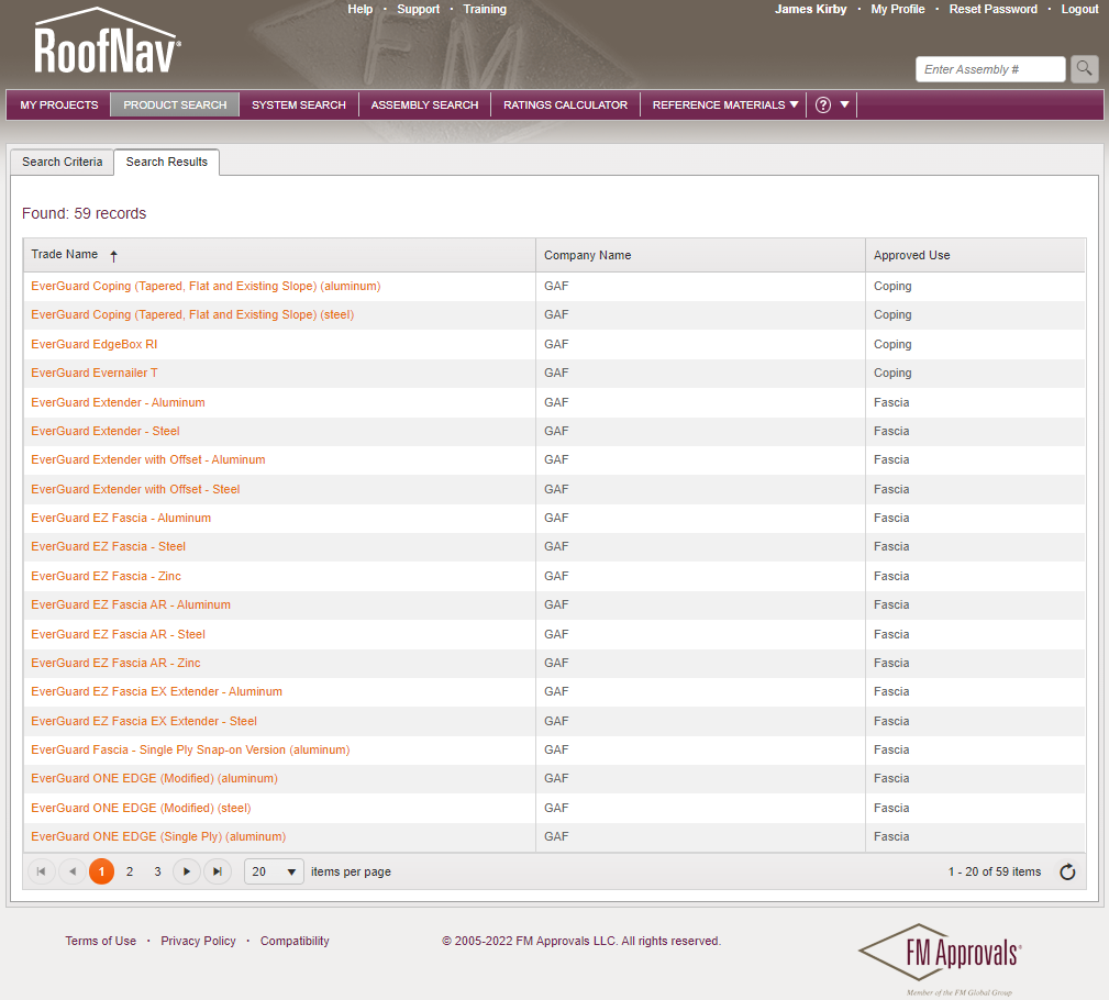 Currently, GAF has 59 Approval Listings in RoofNav: 12 for Coping, 41 for Fascia, and 6 for Gutter products. A screen capture from RoofNav shows GAF's first 20 products.