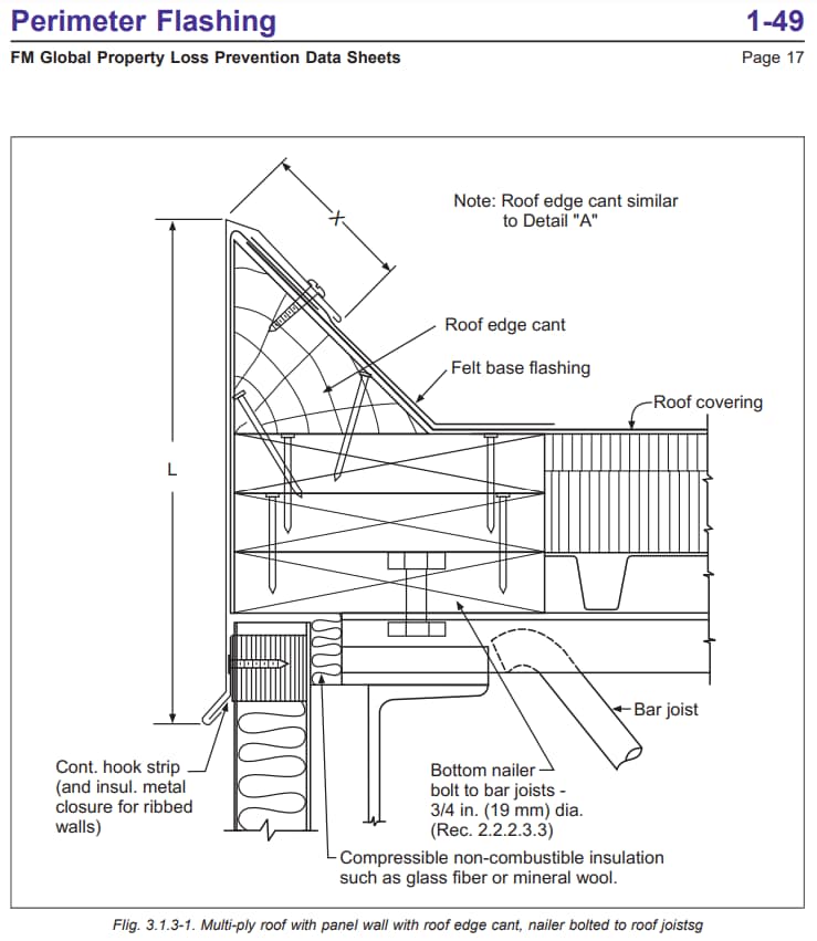 To that end, FM Global Property Loss Prevention Data Sheet 1-49, Perimeter Flashings, provides a number of recommendations for anchoring wood blocking to various types of walls and structural framing. One example of a roof/wall intersection shows the bottom nailer bolted to the bar joists to ensure an adequate load path.