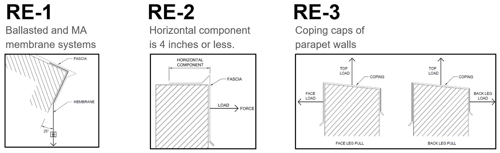 • The RE-3 test method is for copings, and RE-3 includes two tests. One test includes an upward load and a 'face' load; the second test includes an upward load and the 'back leg' load.