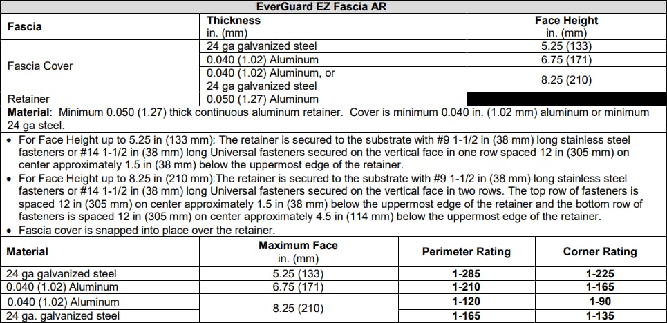 Looking closely at the Listing, the EverGuard EZ Fascia AR – Steel provides detailed information about the product itself and the installation requirements. As shown below, the listing includes multiple Ratings (i.e., wind-uplift capacity) based on material type and thickness, and face height.