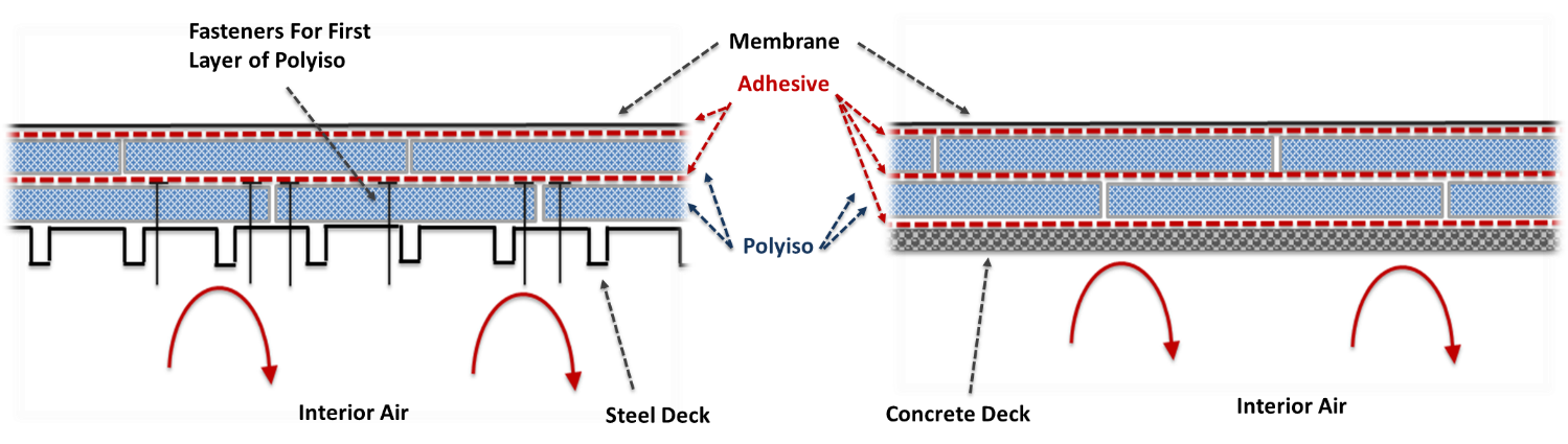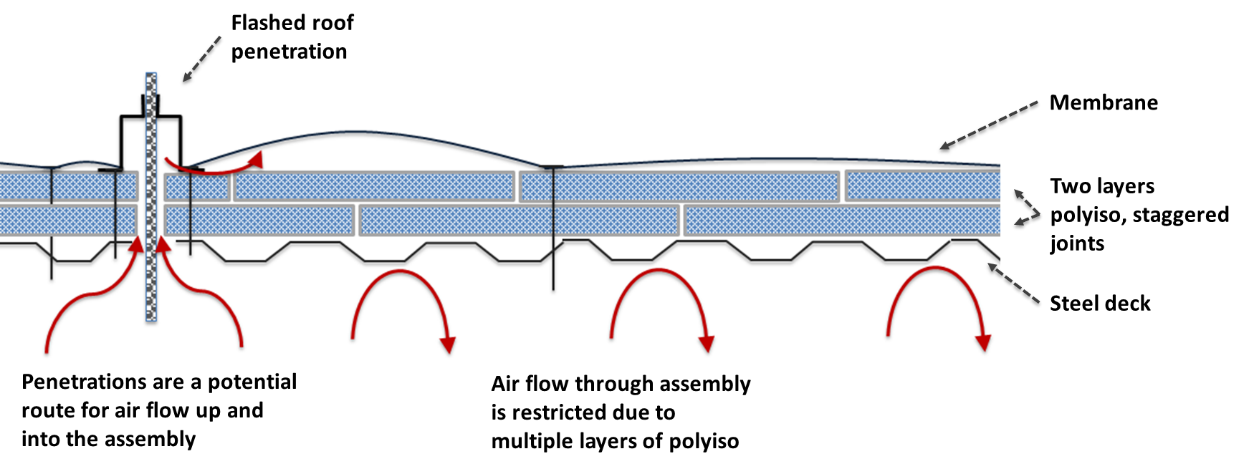 Figure 3: "Better Scenario" with the first layer of insulation mechanically attached and subsequent layers of the roof system adhered, greatly reducing the air flow into the roof assembly.