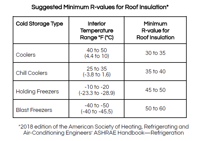The effectiveness of roof insulation is determined by its R-value. According to Energy Star, R-value is a measure of an insulation's ability to resist heat traveling through it. The higher the R-value, the better the thermal performance of the insulation and its effectiveness at maintaining interior temperatures. R-value is typically expressed as a value per inch of insulation, and the recommended R-value of Cold Storage spaces will vary based on the interior temperature, although they are much higher than typically recommended for a traditional building. For comparison, a traditional office building may require an R-value of 30. In the 2018 edition of the American Society of Heating, Refrigeration and Air Conditioning Engineers' ASHRAE Handbook – Refrigeration, there are suggested minimum R-values for Roof Insulation between 30 and 60, depending on the cold storage type.
