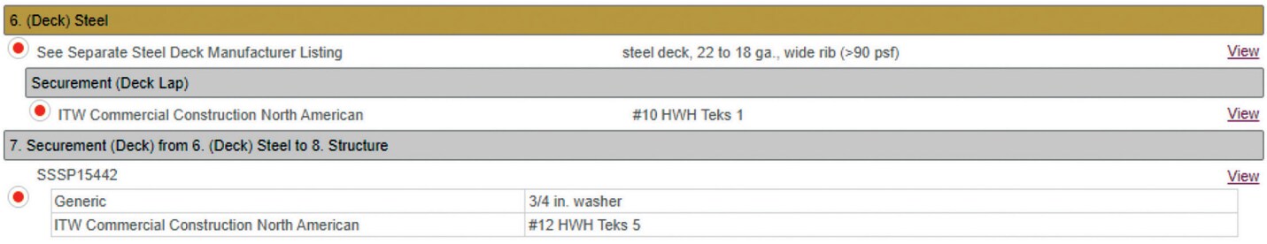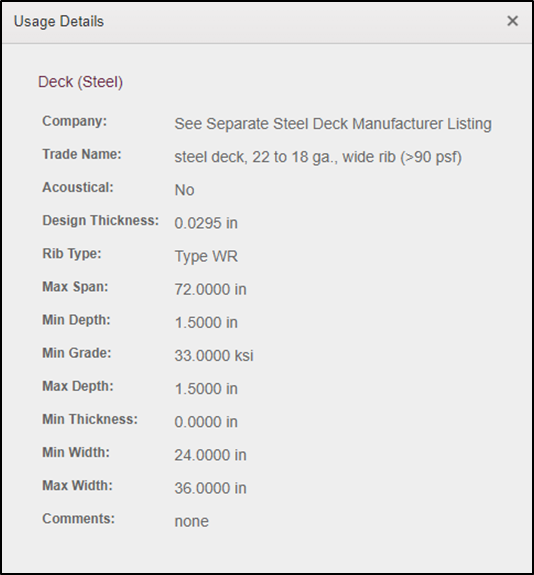 Figure 7: Additional information provided from the "View" link for the steel roof deck.