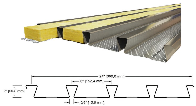 Figure 3: The dimensions of an acoustical dovetail roof deck (bottom); use of sound-deadening insulation in the flutes (top). Figure: CanAm Steel Corporation.
