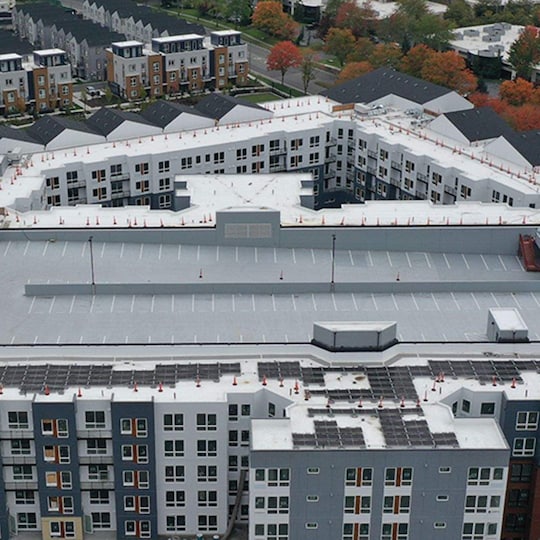 To save time and labor, contractors used GAF Vapor Retarder XL and GAF EverGuard® Quick Spray LV50 Adhesive on the mixed-roof Avalon Bothell Commons.