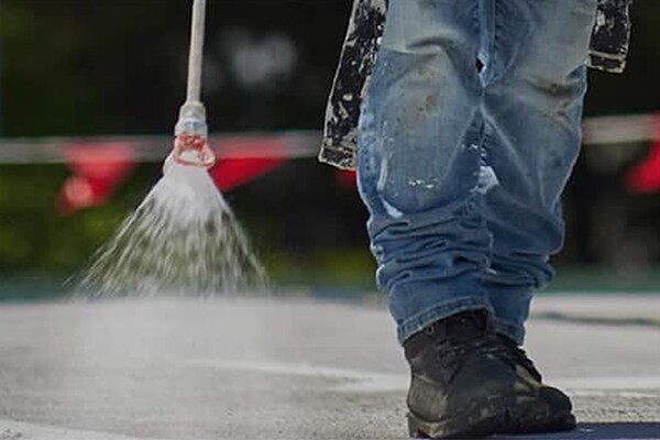 A construction worker using a roller to apply roof coatings to a flat rooftop.