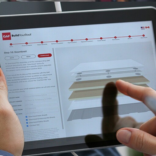 Utilisez le kit de toiture modèle GAF pour personnaliser les couches de toiture réelles et simulées, remplacer des éléments en temps réel et permettre à vos clients de se faire une idée concrète et claire du système de toiture plate que vous leur proposez.